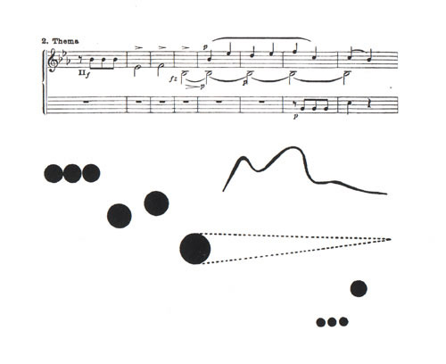Er zijn in Punkt und Linie zur Fläche maar ongeveer twee van de 140 pagina’s speciaal gewijd aan de muziek. In die pagina´s worden beeldende lijnen vergeleken met muzikale lijnen. Dat is eenvoudig te doen met apparaten die geluidsgolven weergeven, zegt Kandinsky. Piano en forte zet hij naast dikke en dunne lijnen; en de muzikale instrumenten worden verdeeld in twee groepen: met een vloeiende lijn (bv. de viool, of de klarinet) en zgn. punt-instrumenten als de piano. Het zijn nauwelijks verrassende opmerkingen. Heel anders dan de zoektocht die hij maakte tussen 1910 en 1913.