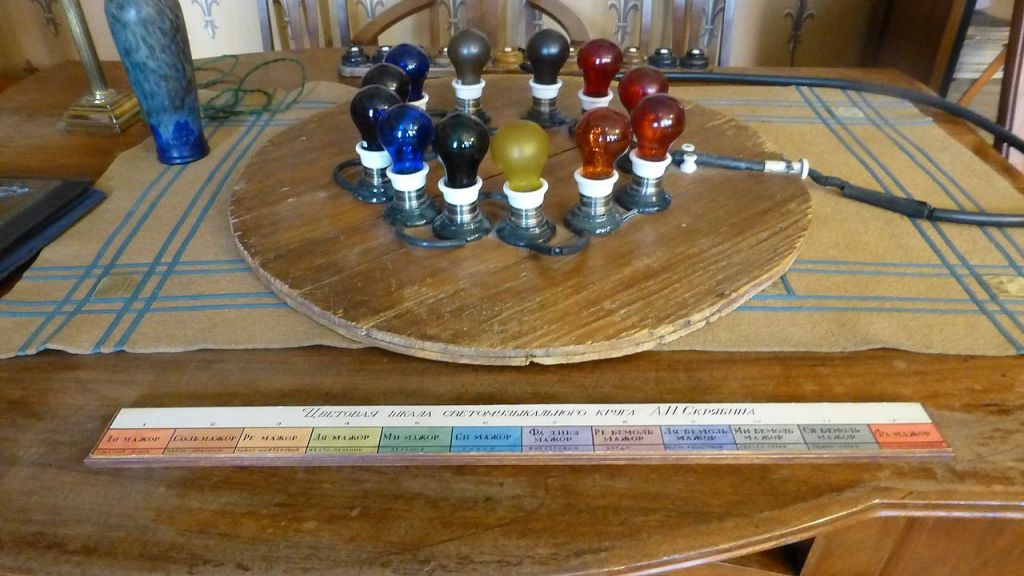 Rechts: het Kleur-licht-orgel bewaard in het museum (voorheen woonhuis) van Aleksandr Skrjabin in Moskou.