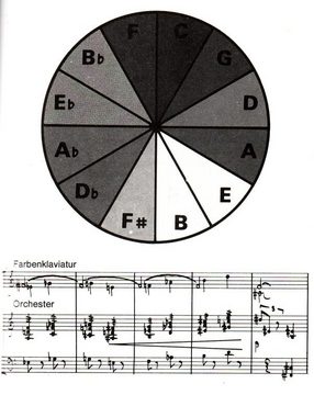 Links: Skrjabin, kleurencirkel uit partituur van Prometheus (1910) met de bovenste notenbalk voor het kleur-licht-orgel.